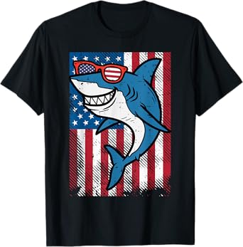 4th July Shark US Flag Independence Day America Men Boys Kid T-Shirt