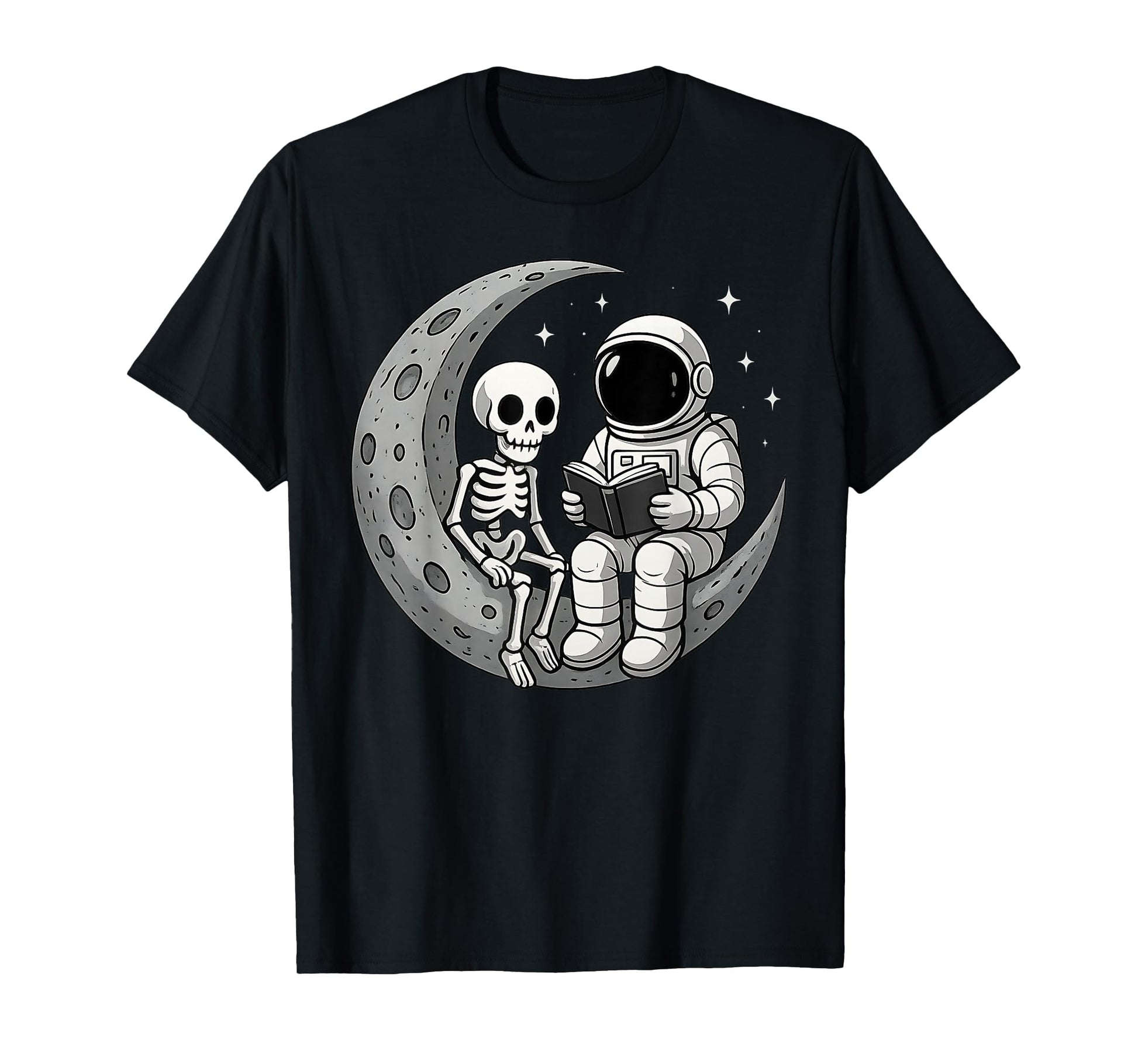 Astronaut Reading Book to Skeleton Moon Space Women Kids Men T-Shirt