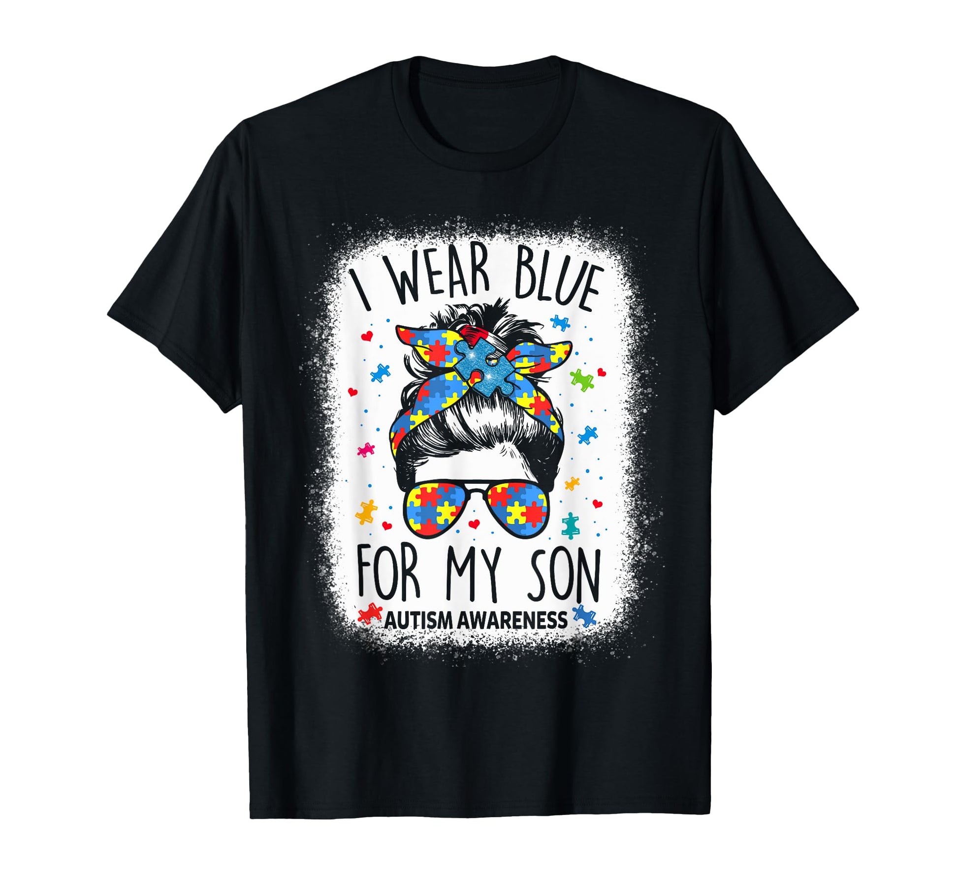 Autism Awareness shirt Mom Messy Bun I Wear Blue For My Son T-Shirt