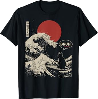"BRUH." The Great Wave Kanagawa Funny Japanese Surfing Cat T-Shirt